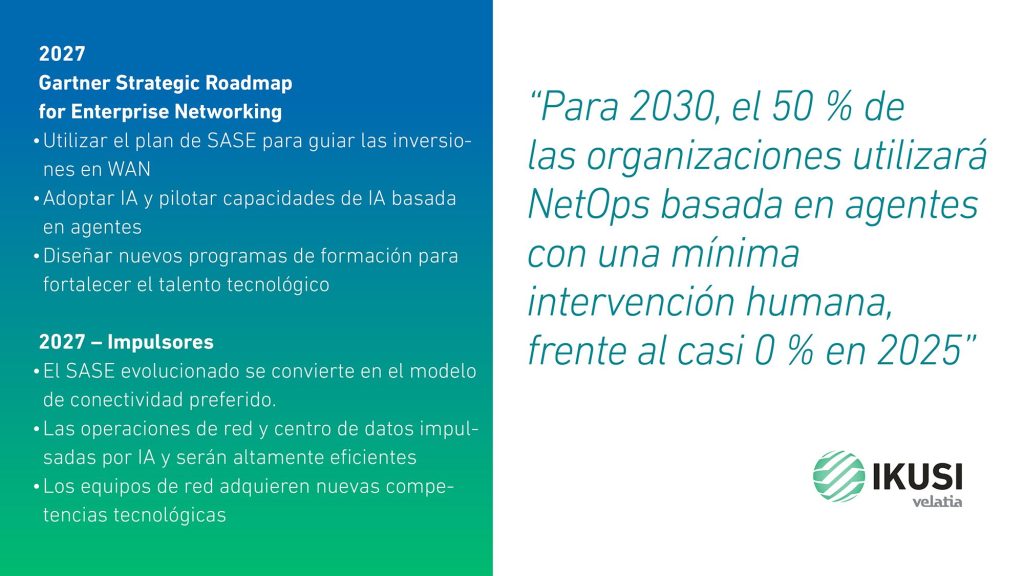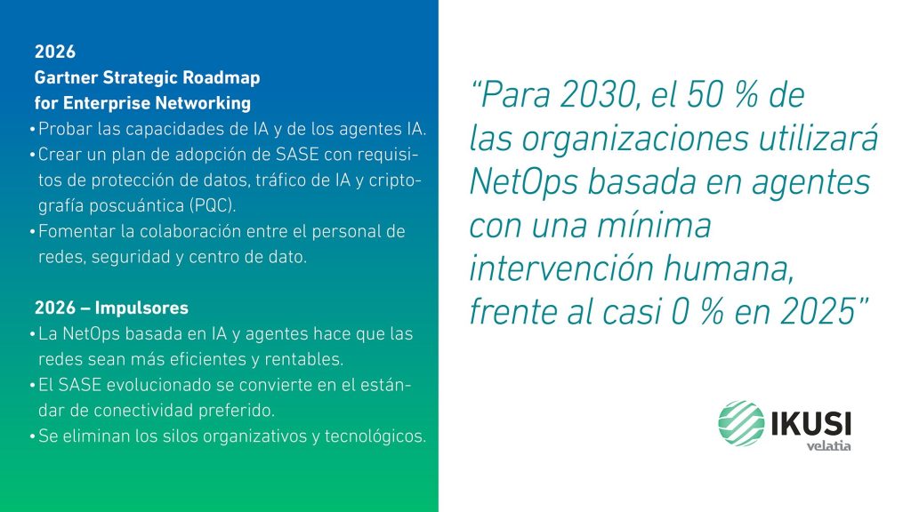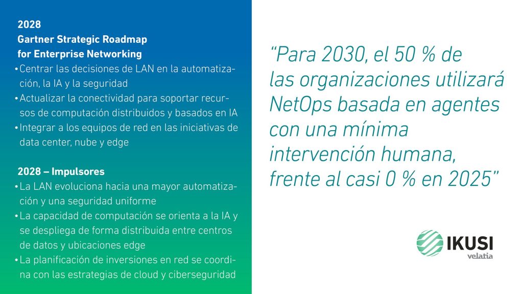 Según el informe de Gartner®, titulado 2026 Strategic Roadmap for Enterprise Networking, “para 2030, el 50 % de las organizaciones utilizará NetOps basada en agentes con una mínima intervención humana, frente al casi 0 % en 2025”.
