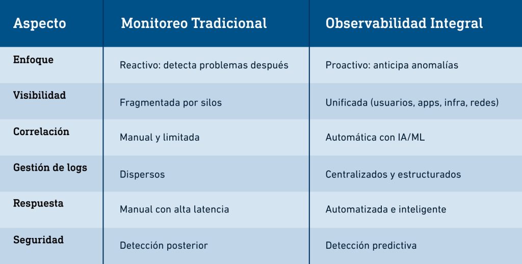 Esta transición requiere una arquitectura que integre métricas, logs y trazas distribuidas con analítica avanzada e inteligencia artificial para identificar patrones anómalos y automatizar respuestas.